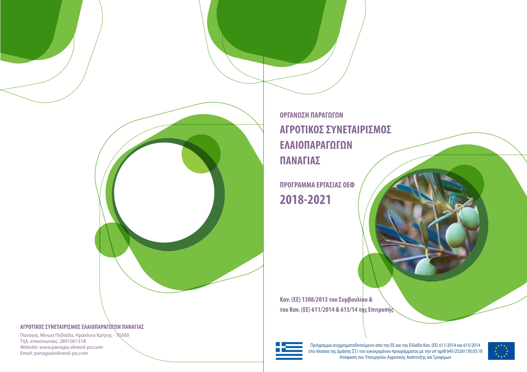 Οι εγκεκριμένες δραστηριότητες του προγράμματος της Ο.Ε.Φ. – Αγροτικός Συνεταιρισμός Ελαιοπαραγωγών Παναγιάς εντάσσονται στους ακόλουθους πέντε (5) τομείς δράσεων που καθορίζονται από το Άρθρο 3 παράγραφος 1 του Κανονισμού (ΕΕ) αριθ. 611/2014 και αποτελούν επιλέξιμες δραστηριότητες για Ενωσιακή και Εθνική χρηματοδότηση.