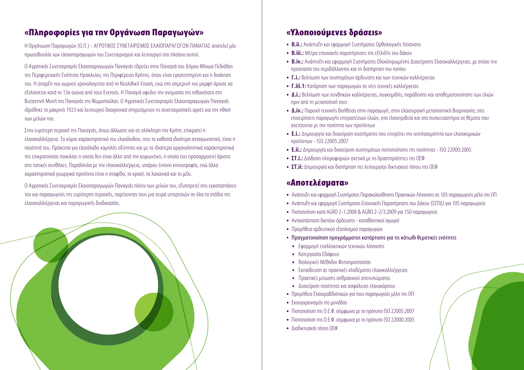 - Τομέας (Δ): Βελτίωση της ποιότητας της παραγωγής ελαιολάδου και επιτραπέζιων ελιών,